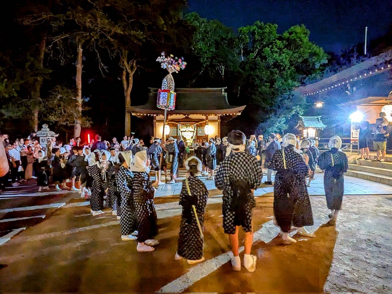 氏子の男児(八歳から十五歳)がカスリの着物をまとい、太鼓の響きに合わせて鉦を鳴らし、古くから伝わる唄を唱和しながら町中を練り歩き、やがて神社へと到着して行灯を奉納する神事です。